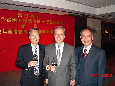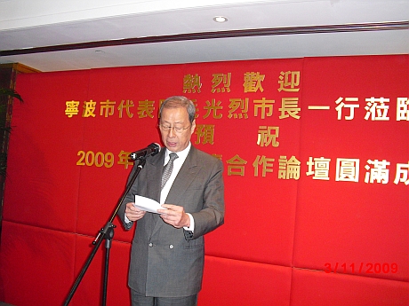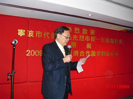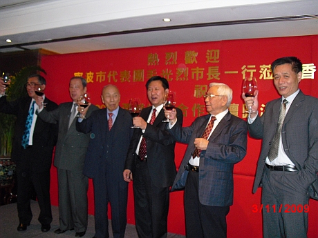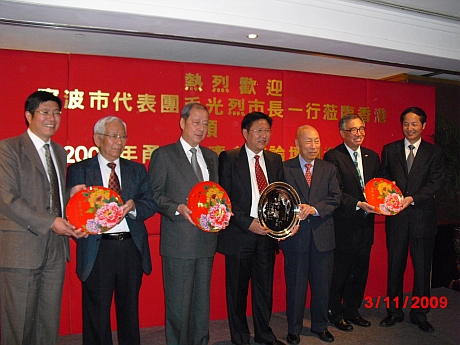 寧波市毛光烈市長、鄔和民副市長和成岳沖副市長將於十一月上旬帶領市政府代表團一行三十多人來港主辦「2009甬港經濟合作論壇」。本會聯同香港寧波同鄉會及香港甬港聯誼會於11月3日晚假灣仔皇朝會設宴招待毛市長及代表團,並預祝2009甬港經濟合作論壇圓滿成功。當晚場面熱鬧,氣氛親切融洽,充份表現了寧波人引以為傲的團結精神。